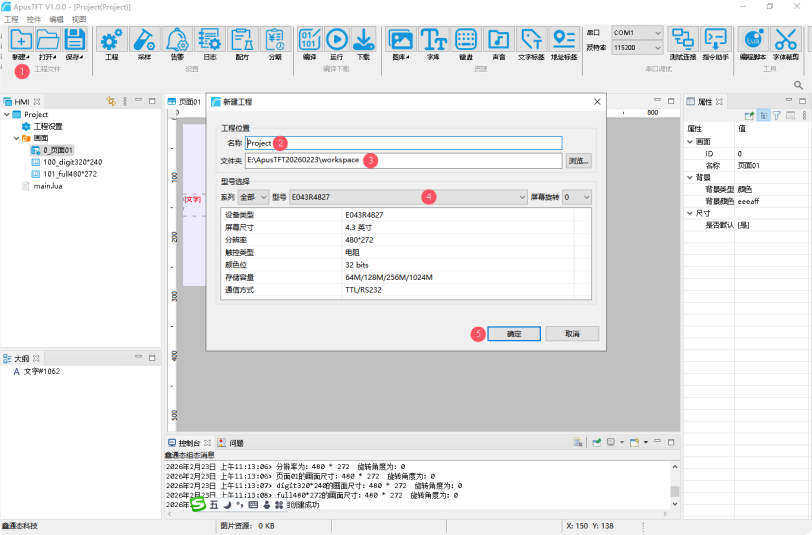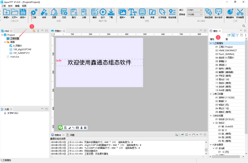 点击ApusTFT 软件菜单栏中【工程设置】按钮,或者双击,在软件右侧属性栏中显示工程属性;