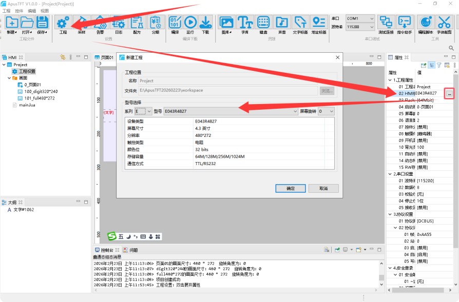 点击ApusTFT 软件菜单栏中【工程设置】按钮,并在【属性区域】找到“02 HMI机型”选项,点击该选项右侧导航按钮,在弹窗中修改HMI 当前机型;