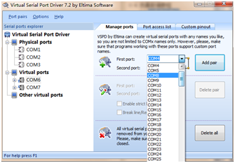 打开虚拟串口软件,假设选择com1和com1为一组虚拟串口,点击Add pair生成一对关联的串口,如下所示:
