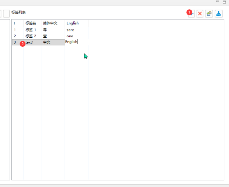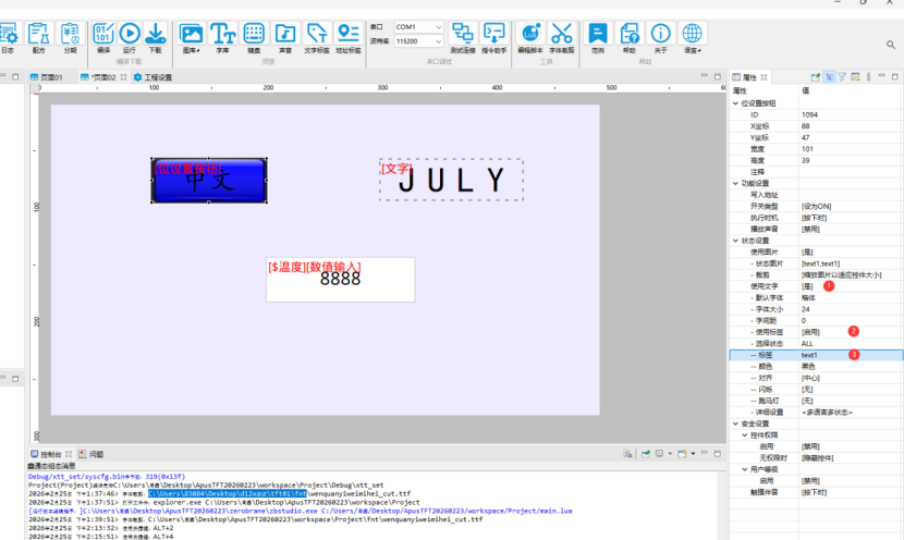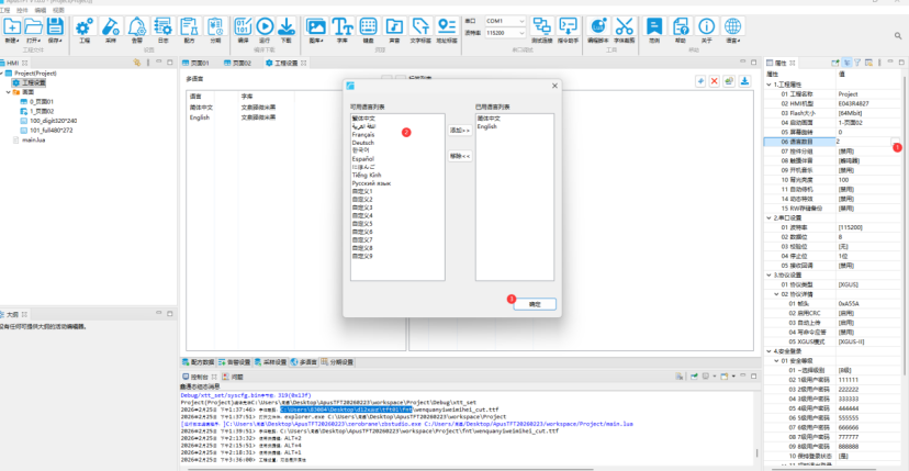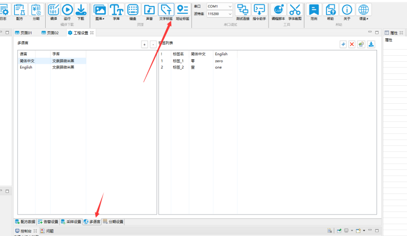 点击 ApusTFT软件菜单栏中【工程设置】按钮 ,在右侧工程属性中找到“语言数”, 输入所需要切换的多语言种数,文字标签窗口中会增加第二种语言的输入列表。