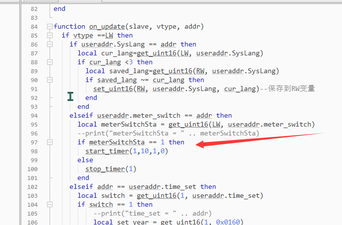 如图所示,当变量meterSwitchSta的值为1时开启定时器,当meterSwitchSta的值为0时关闭定时器。